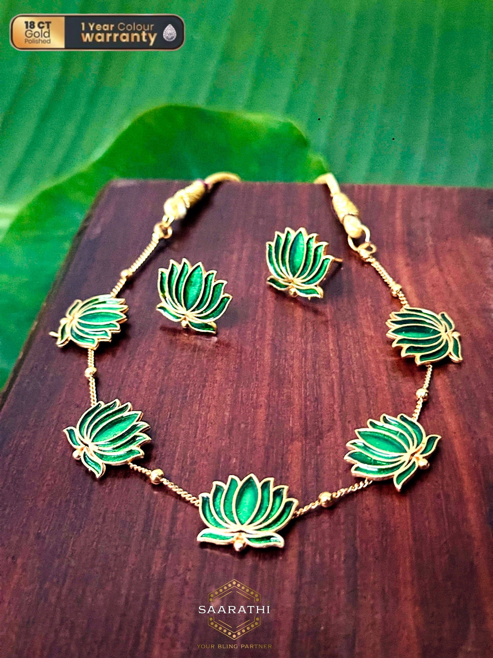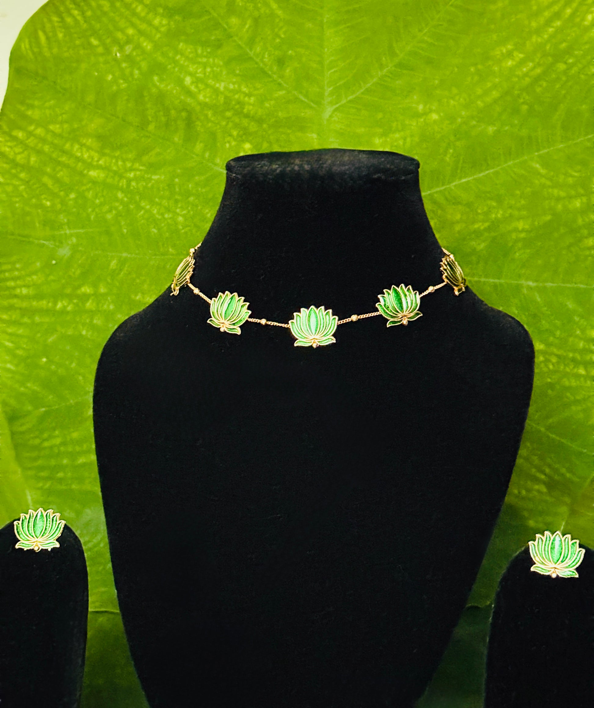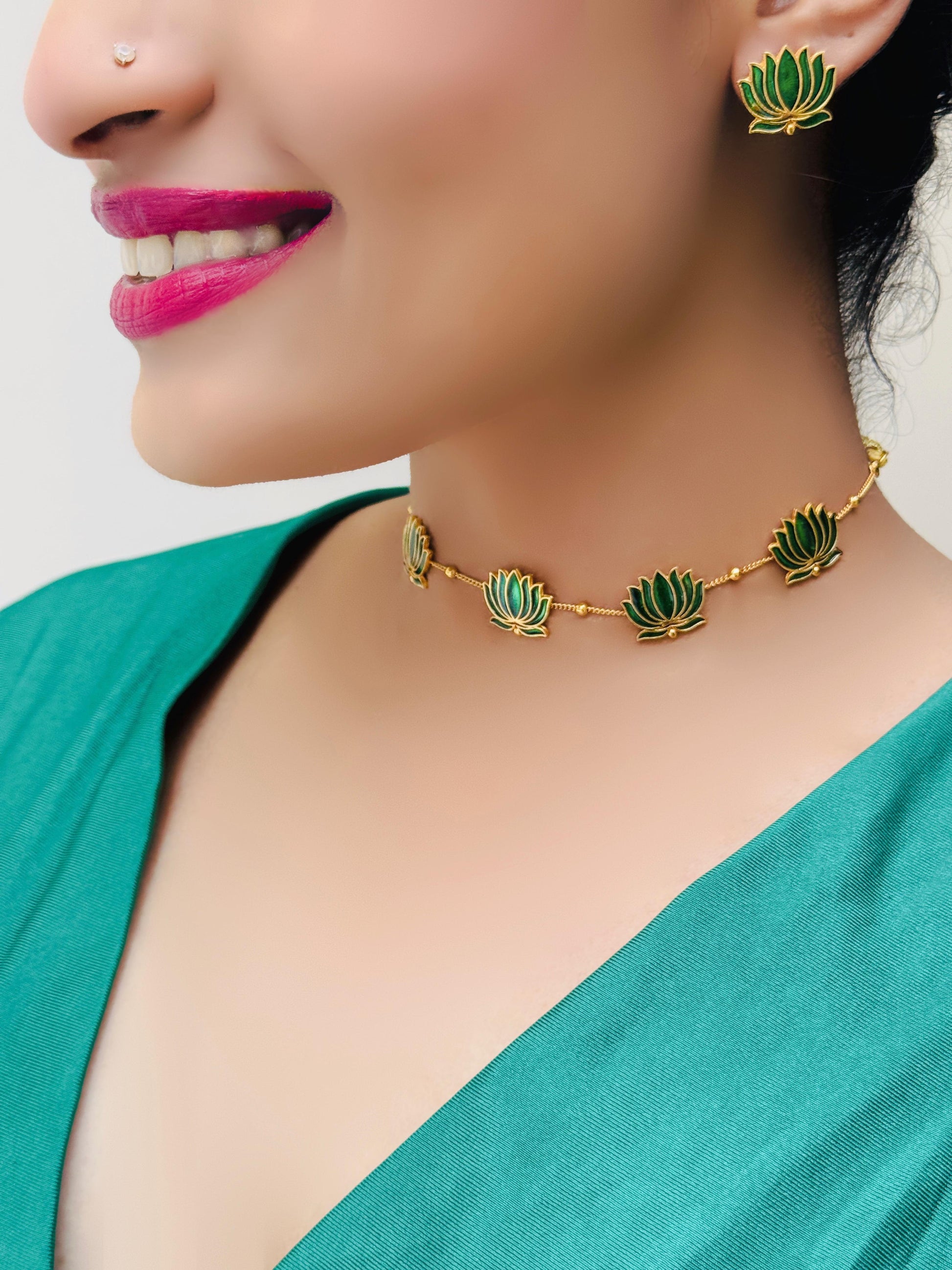 Narayani Pushp Choker in Golden, Green hues, a playful ode to the auspicious Lotus flower, a symbol of divinity and purity
