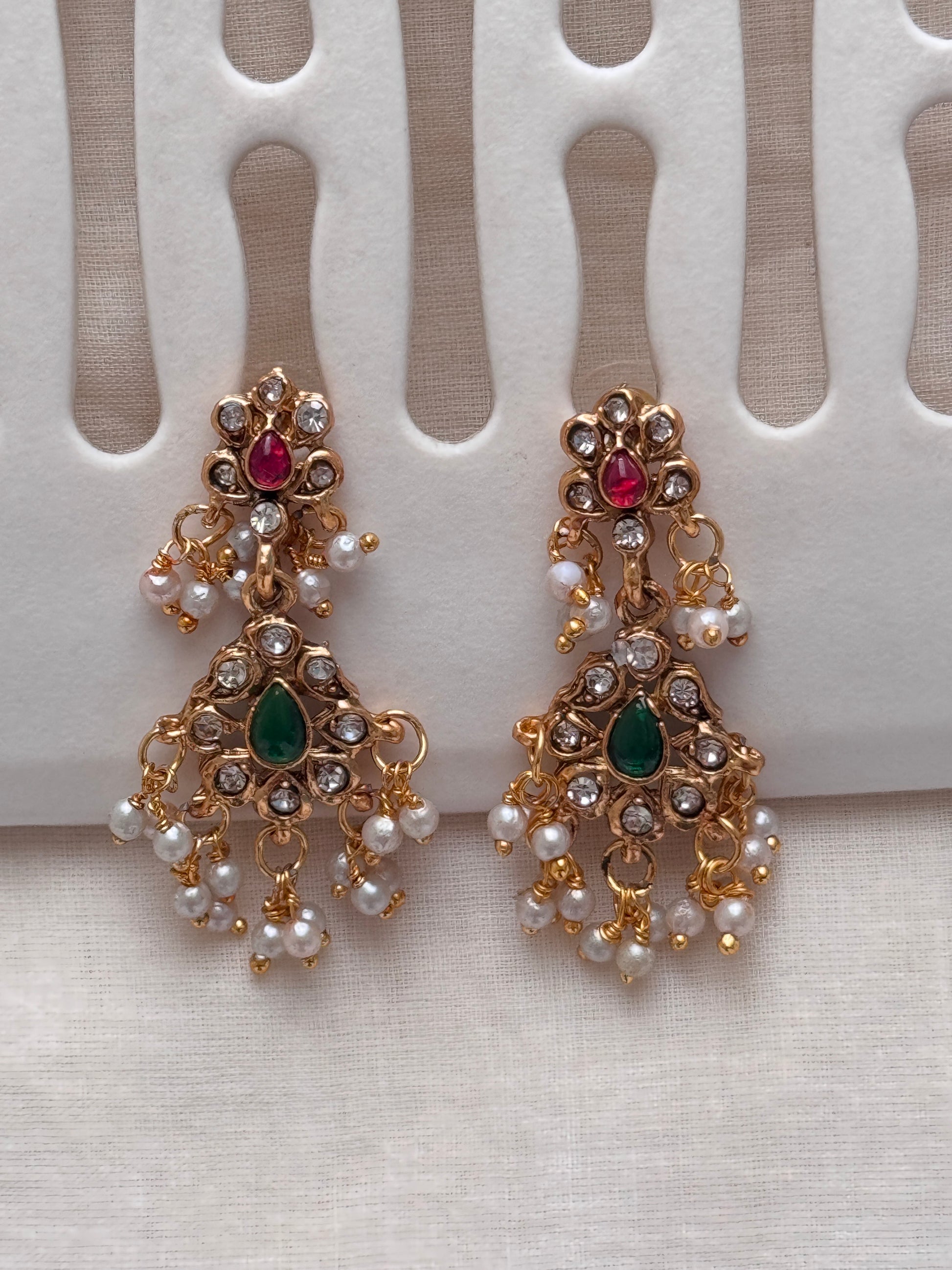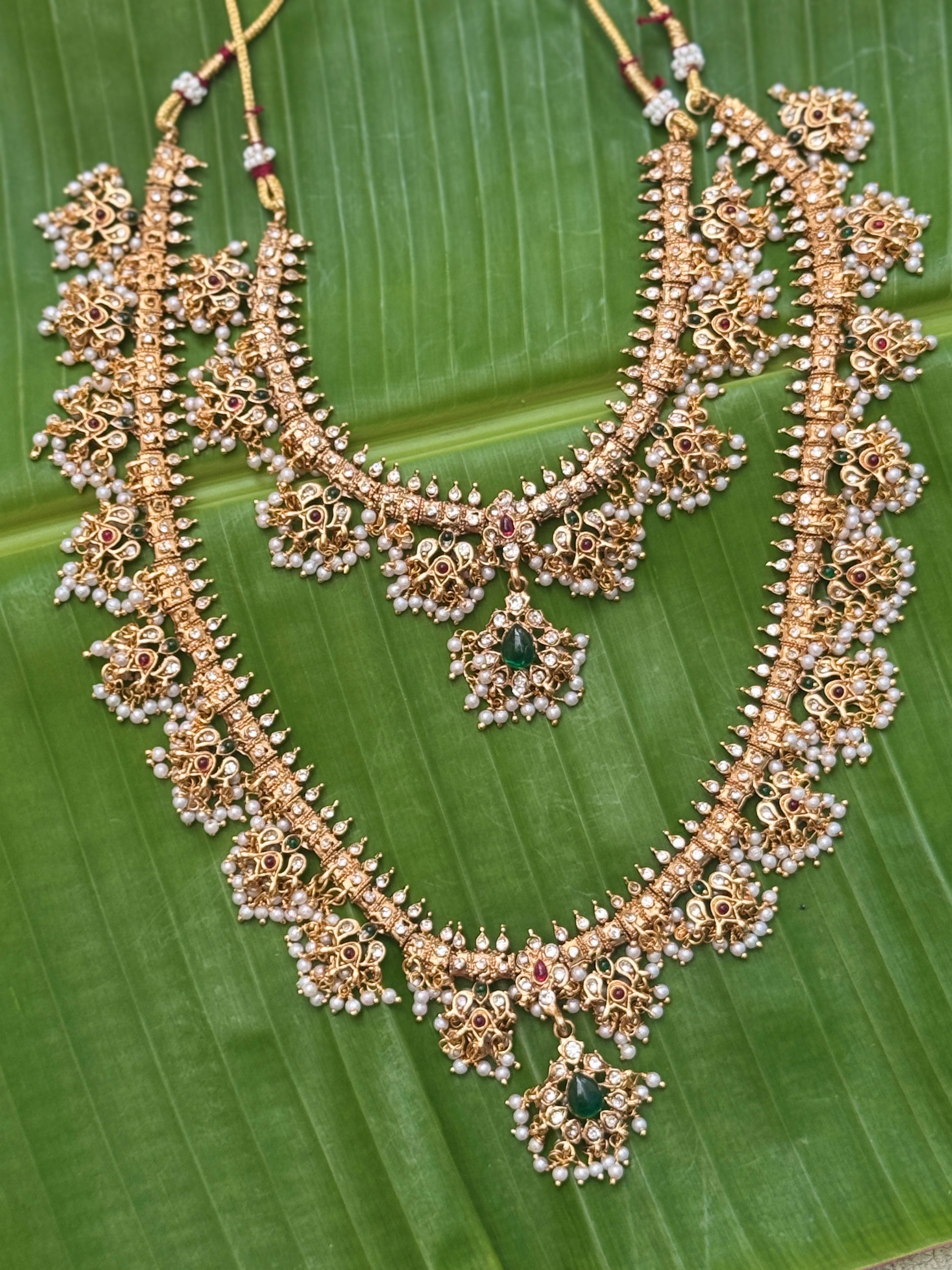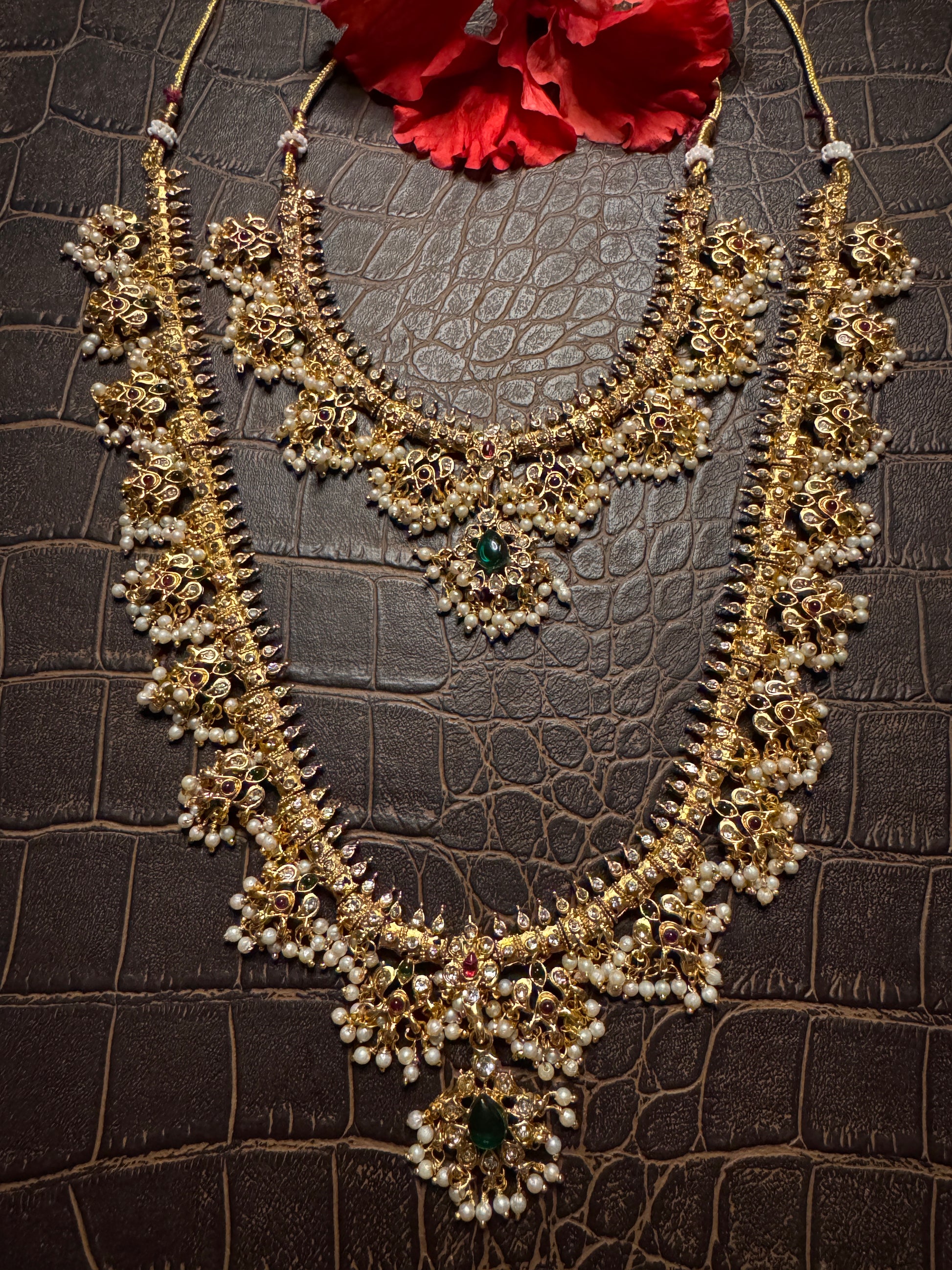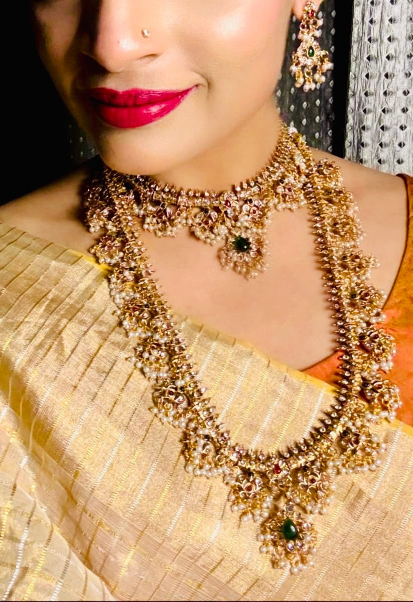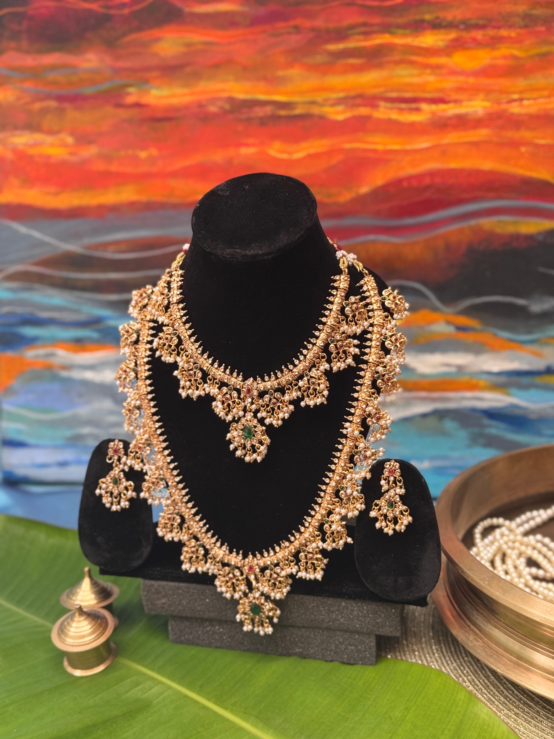 Radhika Pearl Guttapusalu Double Haram Necklace set with Drop Earrings